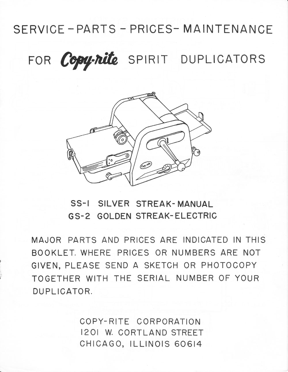 Spirit Duplicators, Stencil Mimeographs, Ditto Machines - these were the personal copying technology of the 20th Century, at least until wet and dry photocopiers became cheap. Maybe you recall the distinct smell of mimeo ink from the still-damp purple-stained test sheets that you got from your teachers in grade school? If so, or better still, if you are a fan of this old technology and have a machine that you want to get running again, then perhaps you will find this collection of documents of value. I don't normally deal in Ditto/Mimeo documentation, but I do occasionally acquire some in the pursuit of the Operation O.O.P.R.A.P. Project, and these I'll scan and offer here for the edification of whoever finds it useful. Currently, I have documentation available for Speed-O-Print, Copy-Rite and Rex-O-Graph duplicators.