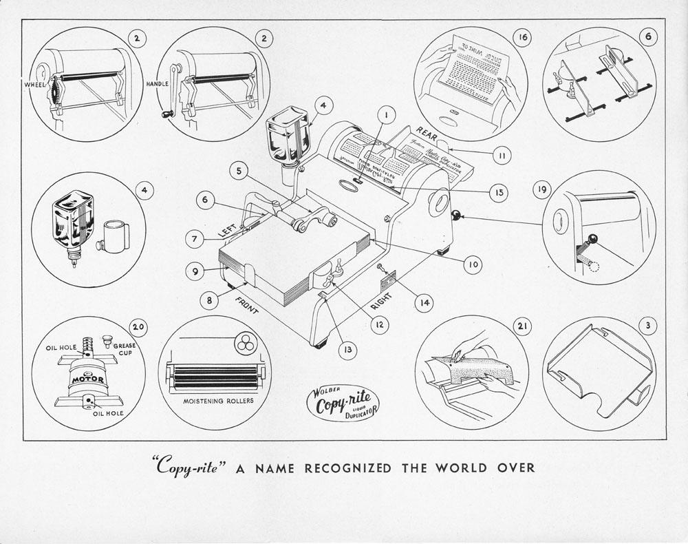Spirit Duplicators, Stencil Mimeographs, Ditto Machines - these were the personal copying technology of the 20th Century, at least until wet and dry photocopiers became cheap. Maybe you recall the distinct smell of mimeo ink from the still-damp purple-stained test sheets that you got from your teachers in grade school? If so, or better still, if you are a fan of this old technology and have a machine that you want to get running again, then perhaps you will find this collection of documents of value. I don't normally deal in Ditto/Mimeo documentation, but I do occasionally acquire some in the pursuit of the Operation O.O.P.R.A.P. Project, and these I'll scan and offer here for the edification of whoever finds it useful. Currently, I have documentation available for Speed-O-Print, Copy-Rite and Rex-O-Graph duplicators.