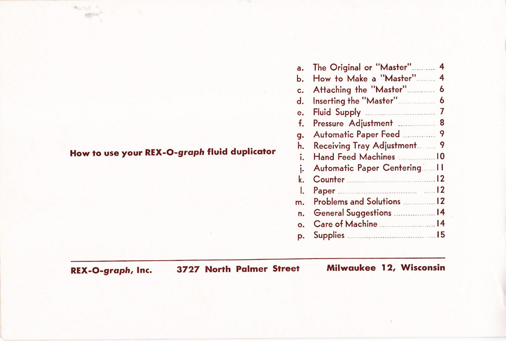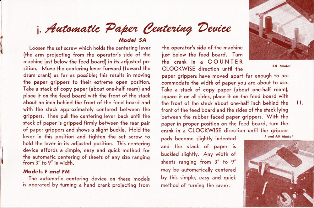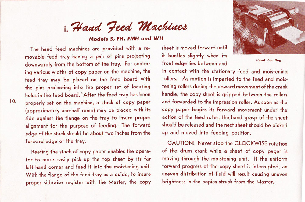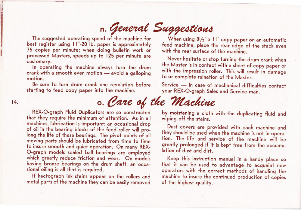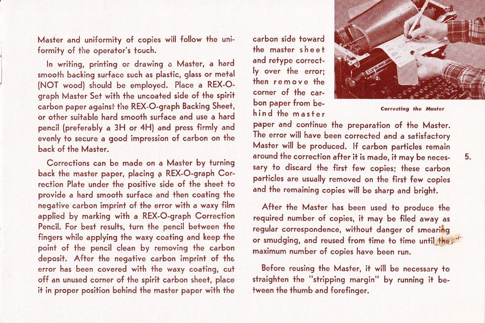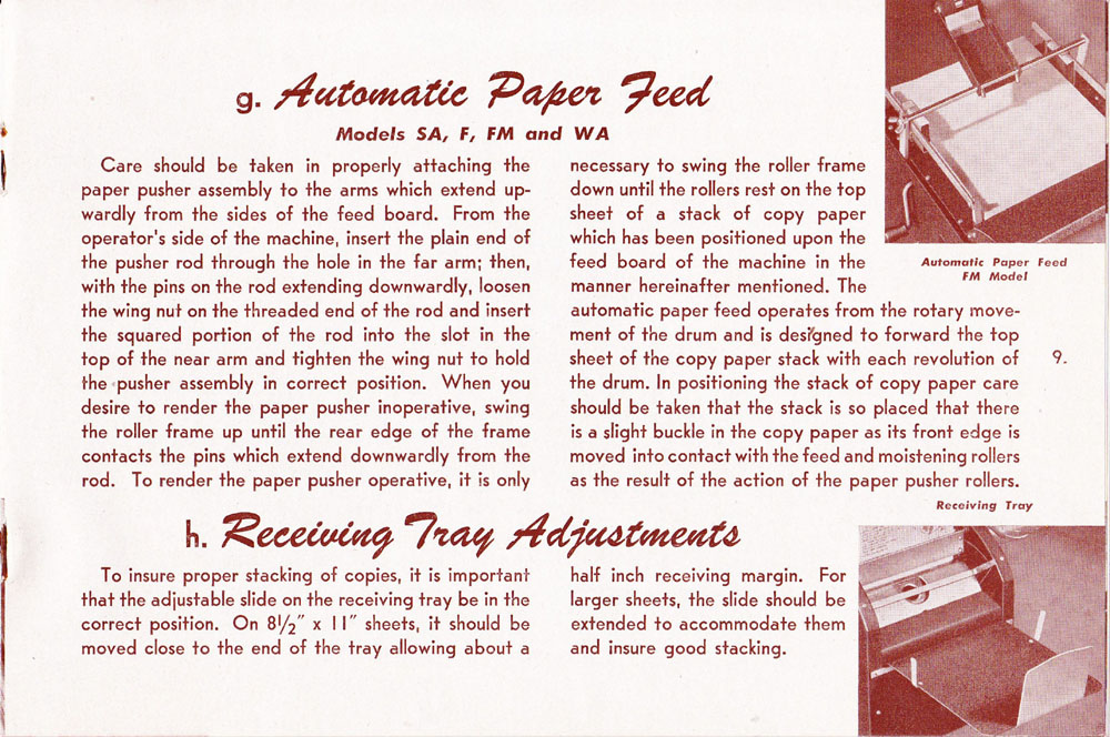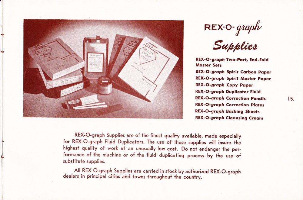 Spirit Duplicators, Stencil Mimeographs, Ditto Machines - these were the personal copying technology of the 20th Century, at least until wet and dry photocopiers became cheap. Maybe you recall the distinct smell of mimeo ink from the still-damp purple-stained test sheets that you got from your teachers in grade school? If so, or better still, if you are a fan of this old technology and have a machine that you want to get running again, then perhaps you will find this collection of documents of value. I don't normally deal in Ditto/Mimeo documentation, but I do occasionally acquire some in the pursuit of the Operation O.O.P.R.A.P. Project, and these I'll scan and offer here for the edification of whoever finds it useful. Currently, I have documentation available for Speed-O-Print, Copy-Rite and Rex-O-Graph duplicators.