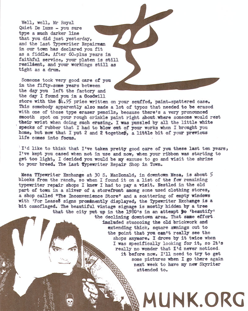Where the Royal Quiet De Luxe gets a new ribbon, and I verify the existence of an operational old-school typewriter repair shop. A typecast dispatch by the Right Reverend Theodore Munk.